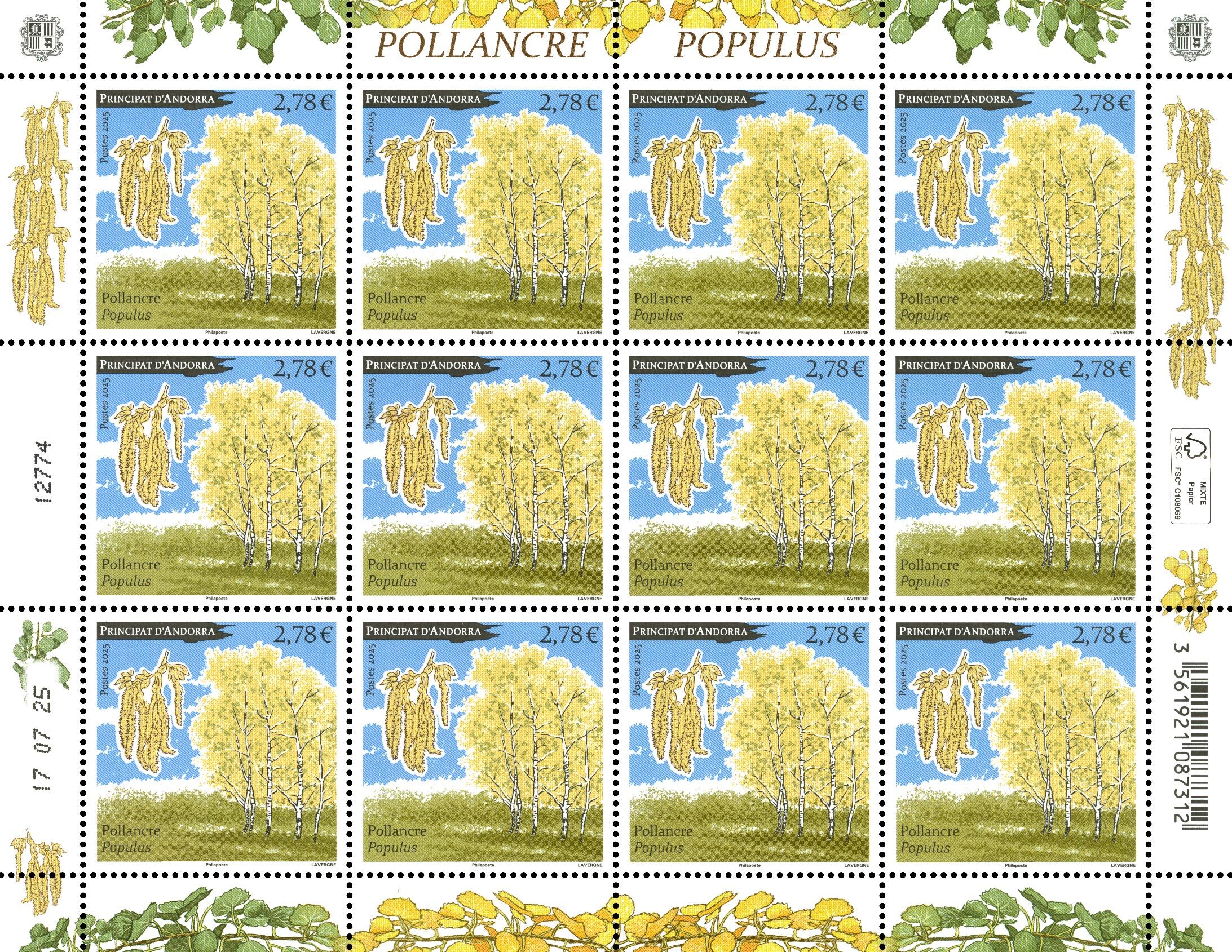 Le timbre à 2,78 € « Peuplier » émis le 4 octobre a été imprimé en procédé mixte offset – taille-douce en feuilles de 12. Son tirage est de 50.004 exemplaires. Le coin daté est le 17.07.25. Le timbre ainsi que les inscriptions marginales ont été réalisés par André LAVERGNE , tandis que la mise en page a été réalisée par Philaposte.