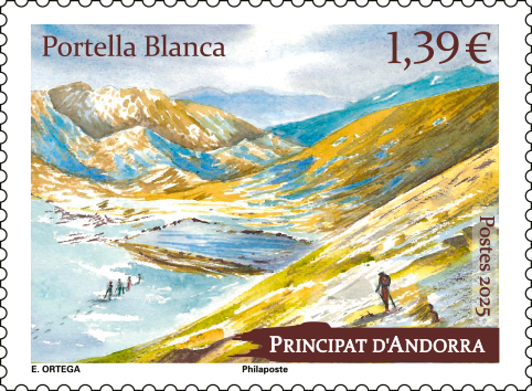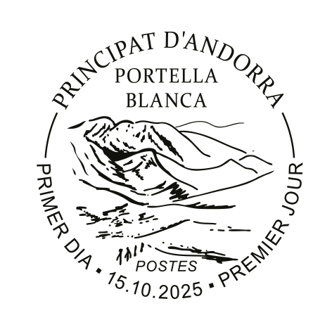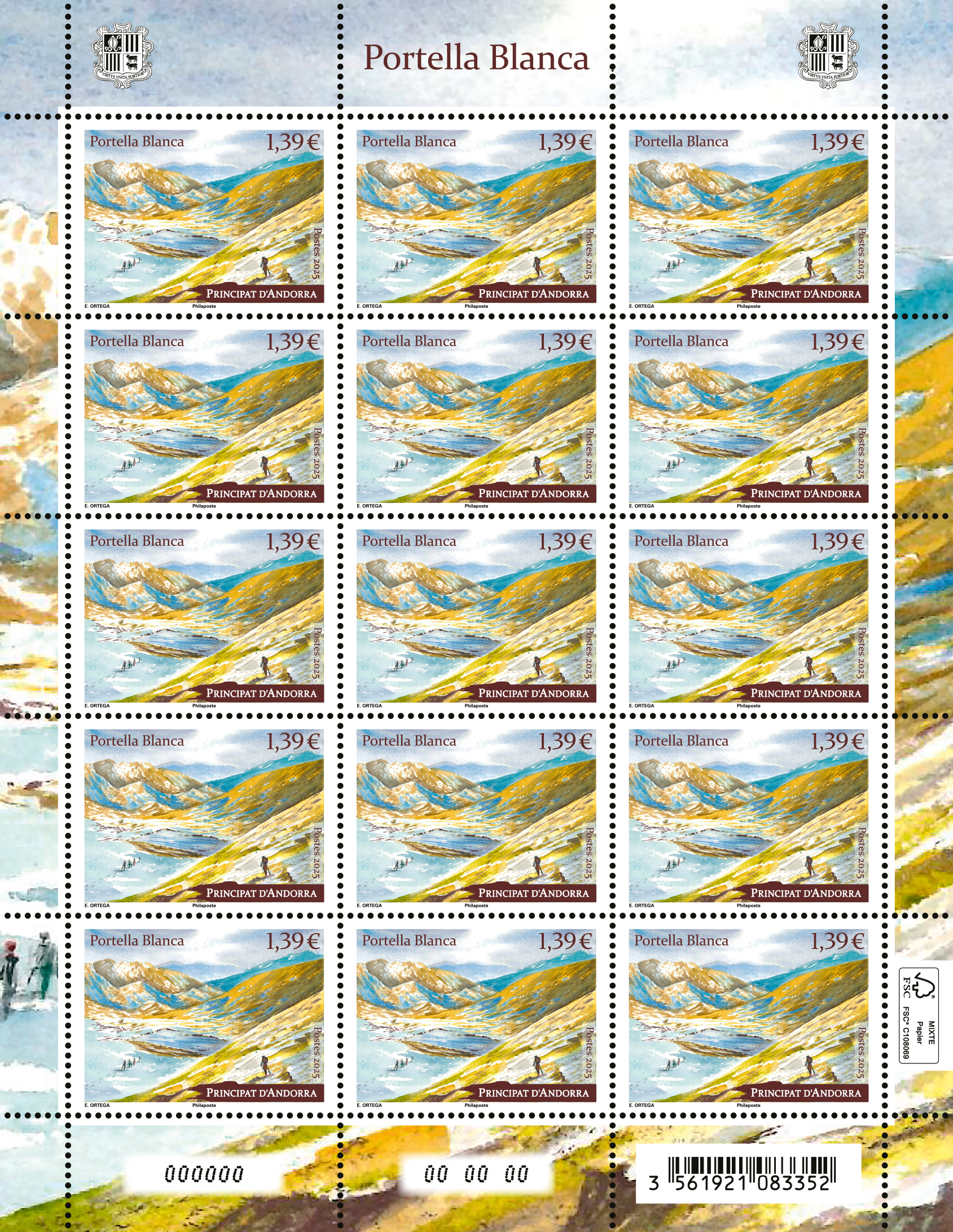 Le timbre à 1,39 € « Portella Blanca » émis le 15 octobre a été imprimé en offset en feuilles de 15. Son tirage est de 50.010 exemplaires. Le coin daté est le 17.07.25. Le timbre ainsi que les inscriptions marginales ont été réalisés par Elisendra ORTEGA, tandis que la mise en page a été réalisée par Philaposte.