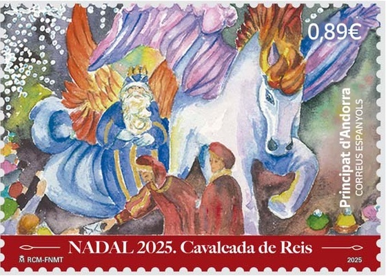 Cavalcade des Rois émis le 06/11/2025 par la poste espagnole Le timbre à 0,89 € "Cavalcade des Rois" a été émis le 6 novembre et imprimé en offset en feuilles de 25. Le tirage est de 45.000 exemplaires. Source : BOE-A-2025-21894