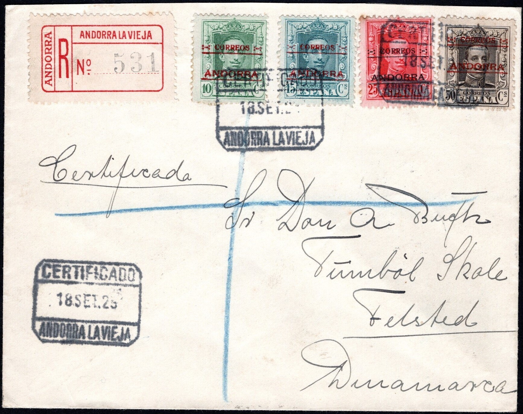 Cette lettre recommandée est partie du bureau d'Andorra la Vella le 18 septembre 1928 à destination de Felsted, une petite bourgade du sud du Danemark.