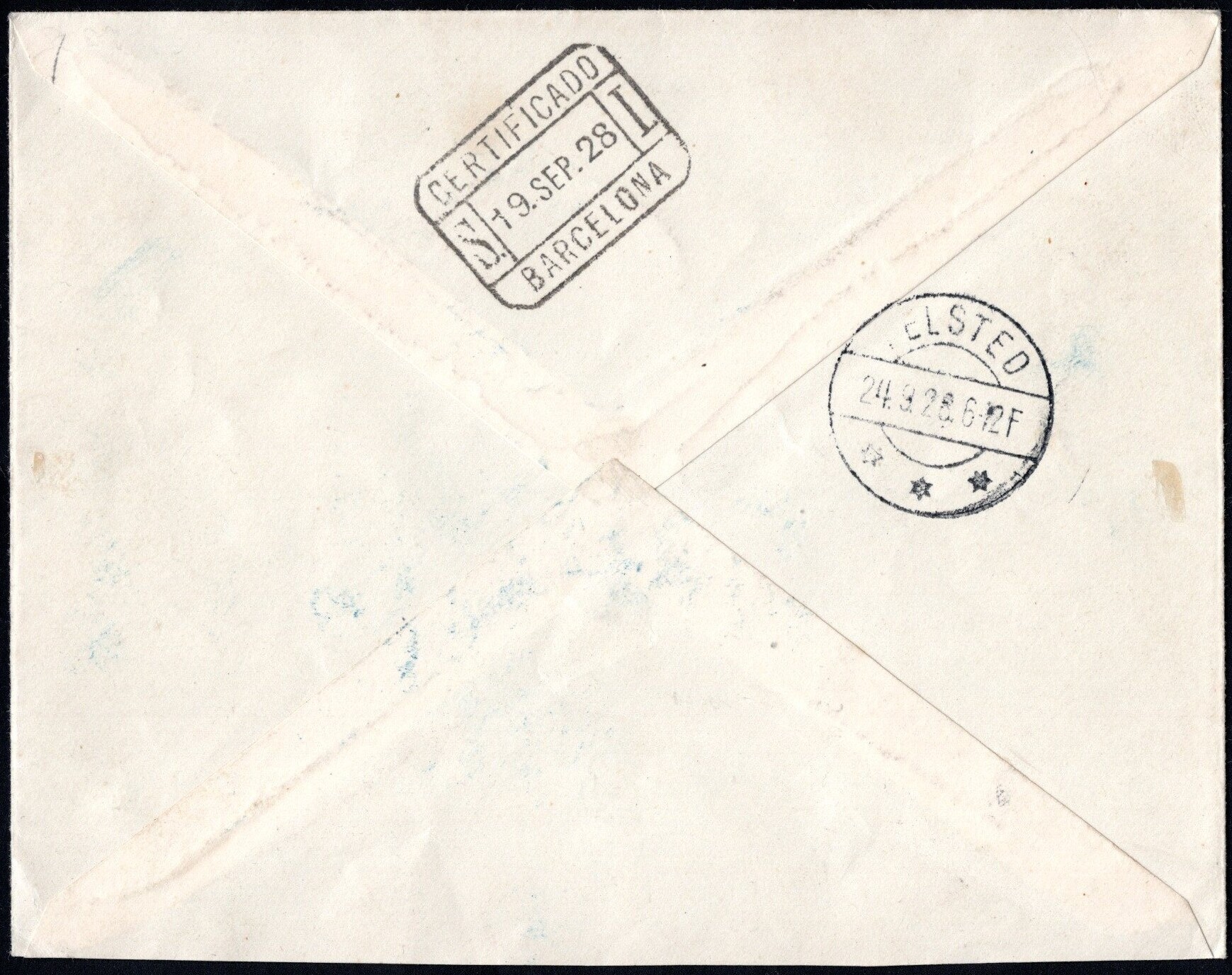 Au verso se trouvent le cachet de transit à Barcelona du 19 septembre et le cachet d'arrivée à Felsted du 24 septembre.